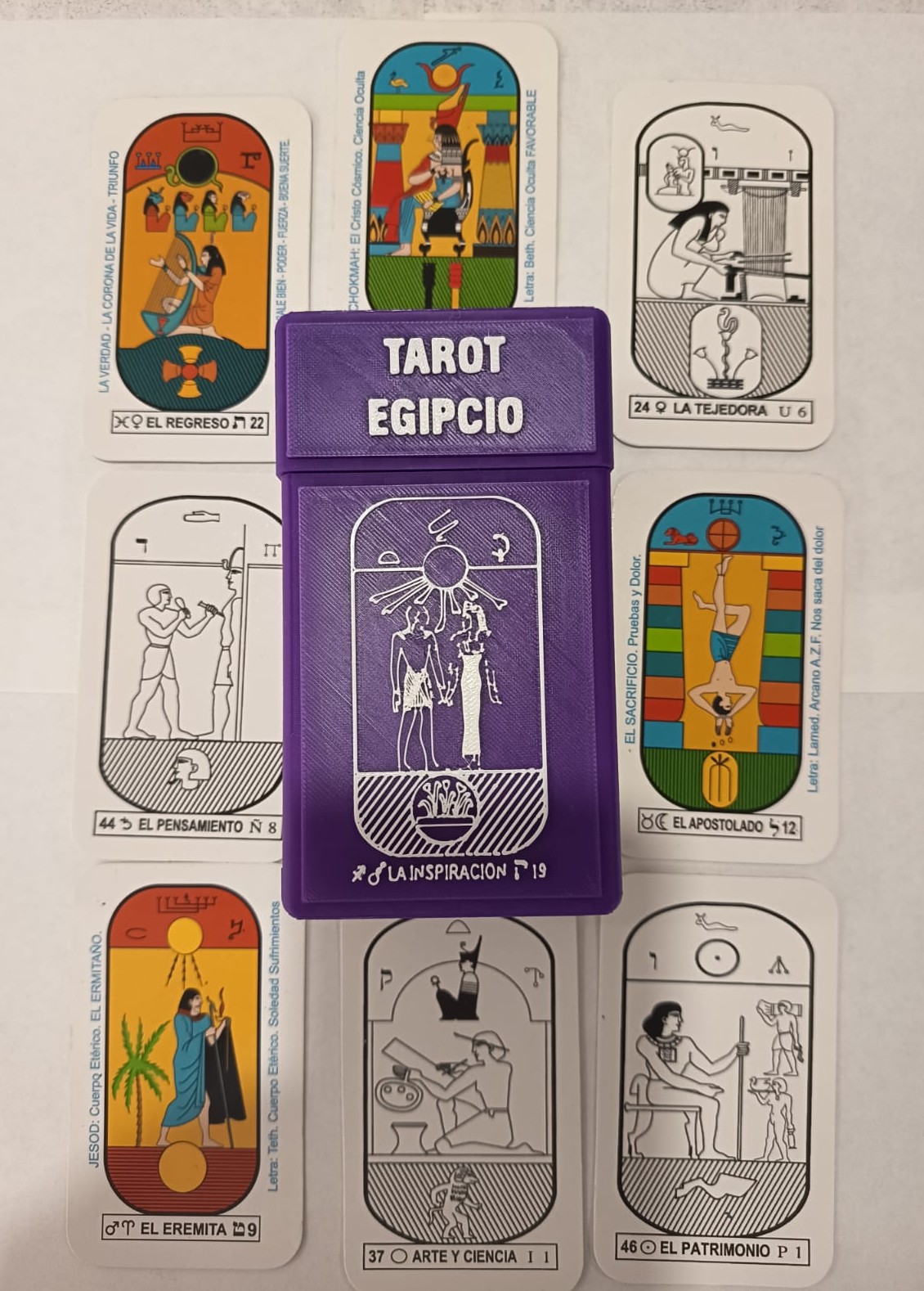 Cartas Tarot EgipcioPrecio de venta: $100.000 Incluye las 78 cartas + estuche en pasta dura. Cada carta por su lado frontal tiene la representación grafica y por el lado del reves tiene la interpretación. Preguntar por este producto